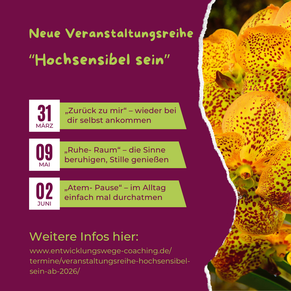 Inspiration, Impulse und Möglichkeiten für deine SelbstregulationMeine neue Veranstaltungsreihe „Hochsensibel sein“ richtet sich an (erwachsene) Menschen, die eine erhöhte Wahrnehmungsfähigkeit bei sich erkannt haben und sich somit selbst als hochsensibel einordnen. Sie besteht aus verschiedenen Einzelangeboten/ Workshops,...