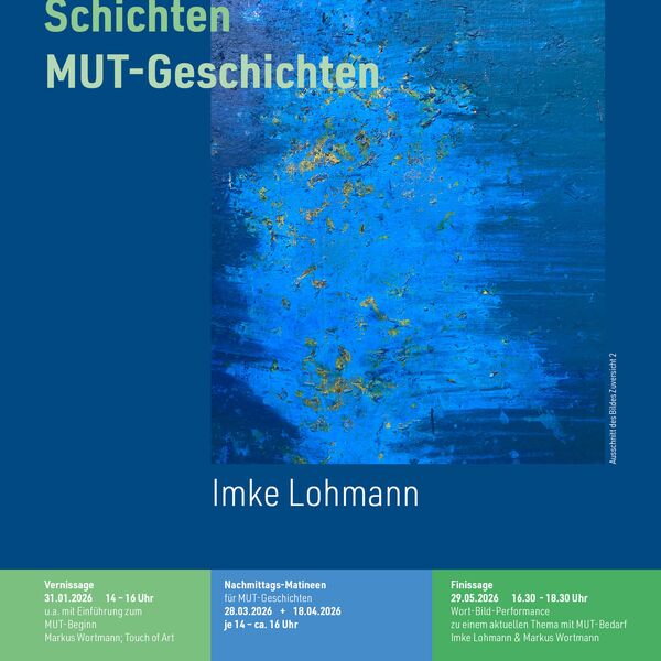 Ausstellung im Bestattungsunternehmen Noller+Ziebell in BielefeldZur Ausstellung: Farben. Schichten. MUT- Geschichten Hintergrund und Intention Imke Lohmann arbeitet ihre Werke aus der Materie heraus. Bei fast allen ihrer Bilder treffen sich die Farben ungemischt auf der Leinwand. Die Künstlerin arbeitet darüber hinaus auch...