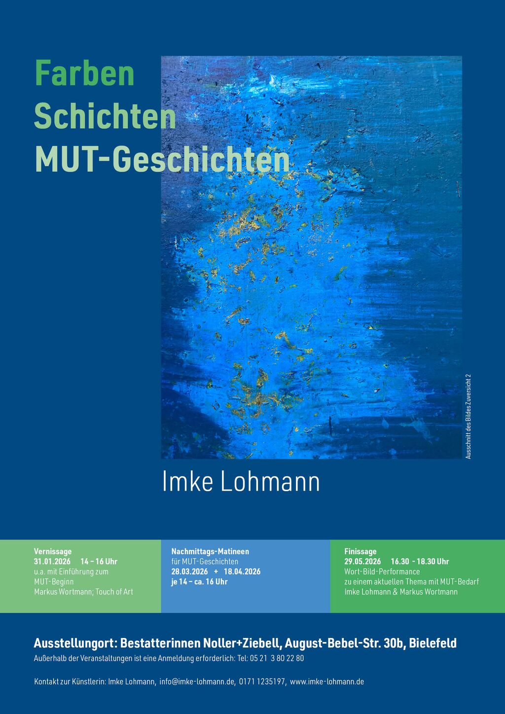 Die Künstlerin wählte zum zweiten Mal das Bestattungsunternehmen als Ort für eine Ausstellung aus, da gerade hier das Lebensende bedenkbar wird, ohne dass Mensch betroffen ist. Es ist ein Ort der Ermutigung, wenn wir Menschen uns für die Idee öffnen können, dass die Endlichkeit eine Lebensrealität ist. Für Imke Lohmann gehört Kunst, Begegnung, Grenzerfahrung und Kreativität zusammen. Sie spricht von der Kreativität, die an Grenzen wächst und gedeiht. Ihr künstlerisches Schaffen begann mit der ersten Teilnahme an der Sommerakademie in Schieder Schwalenberg 2022. Da hatte sie wieder einmal ihr eigenes NEULAND, um ihre Grenzen zu überwinden und „etwas daraus zu machen“, was wir jetzt in dieser dritten Ausstellung von ihr betrachten können.