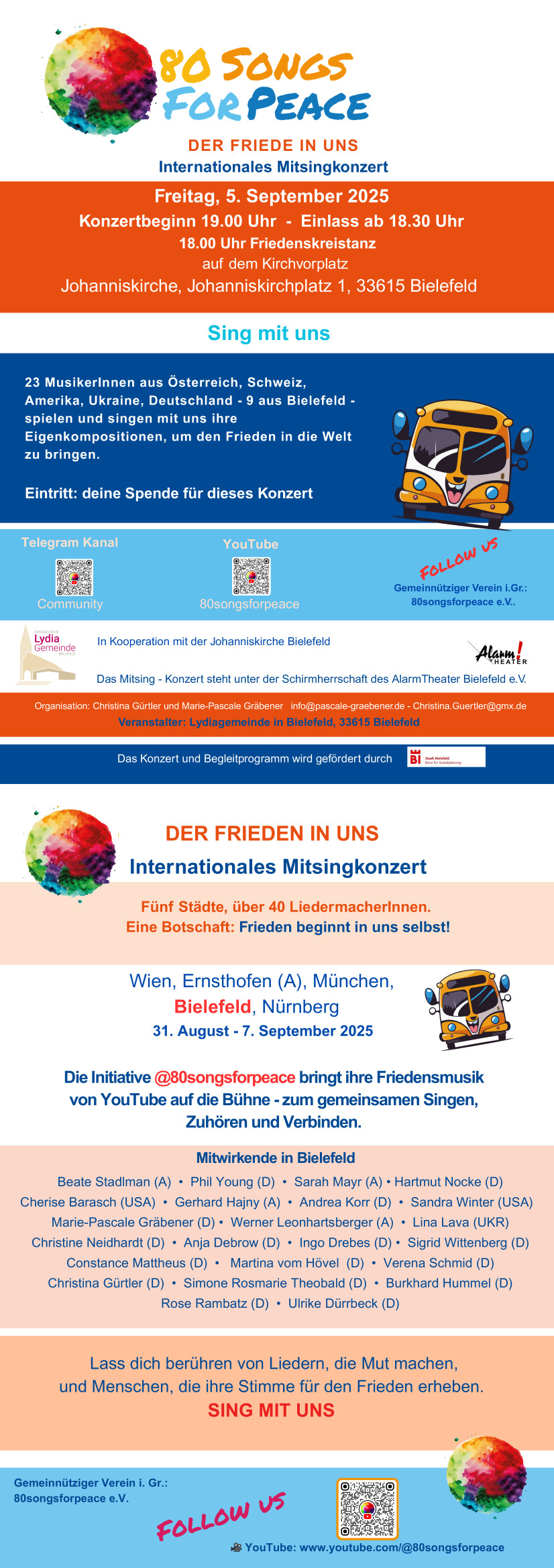 Das Mitsing-Konzert ist generationen-, religions- und kulturübergreifend. An diesem außergewöhnlichen Konzert nehmen insgesamt über 20 Musiker:innen teil, darunter 9 aus Bielefeld und Umgebung und ca. 14 aus Österreich, Amerika, der Schweiz und Deutschland.