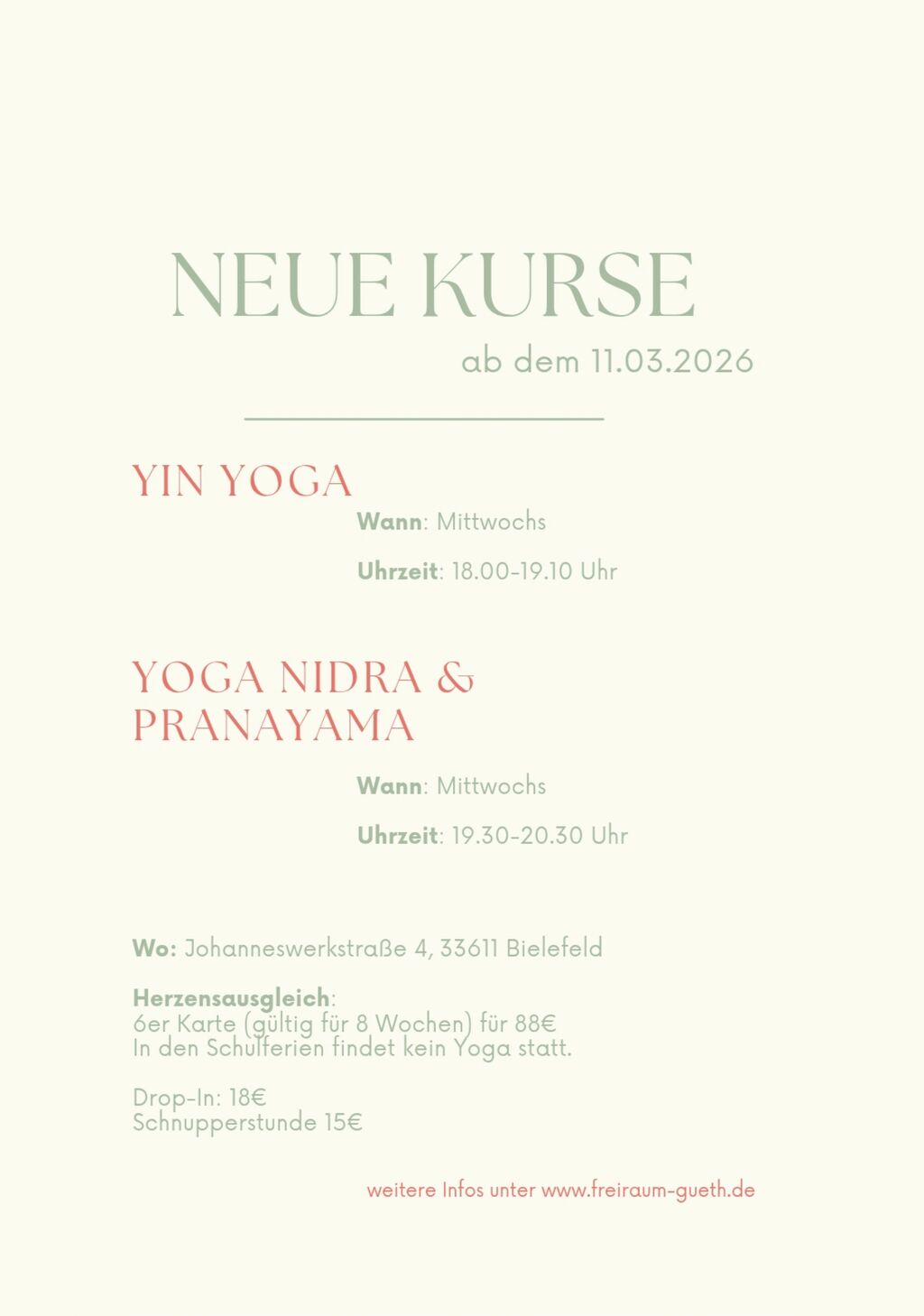 Ab Mittwoch, den 11.3.26 starten meine beiden neuen Yogakurse in Bielefeld. Ich freue mich so sehr auf eine schöne, gemeinsame Yogazeit.