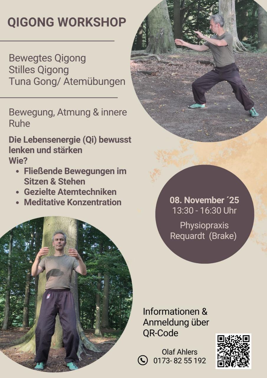 Die ruhigen Bewegungen des Qigong unterstützen einen sanften Energiefluss, der im Malen seinen Ausdruck finden kann. Wir üben die „5-Elemente-Harmonie“. Bewegung, Entspannung und fließende Farben lösen einander ab. Die Bilder, die so entstehen, können die eigenen erlebten und gewonnenen Erfahrungen zum Ausdruck bringen und so zu einer bleibenden Erinnerung beitragen.